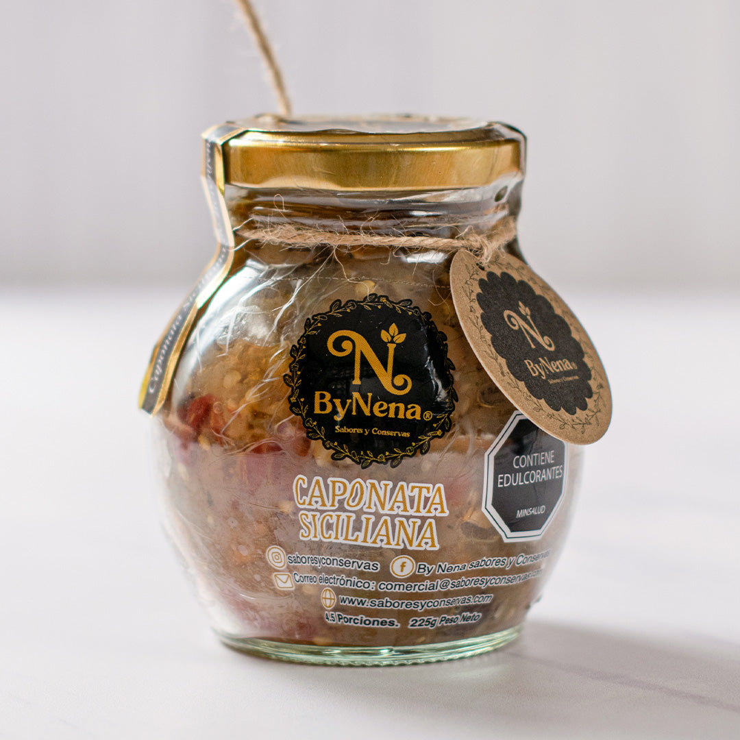 Majestuosa composición de Berenjenas, Aceitunas Negras, Aceitunas Verdes, Alcaparras, Tomates Secos, Almendras laminadas, Pasas o Ciruelas pasas, tipo Estofado, confitadas